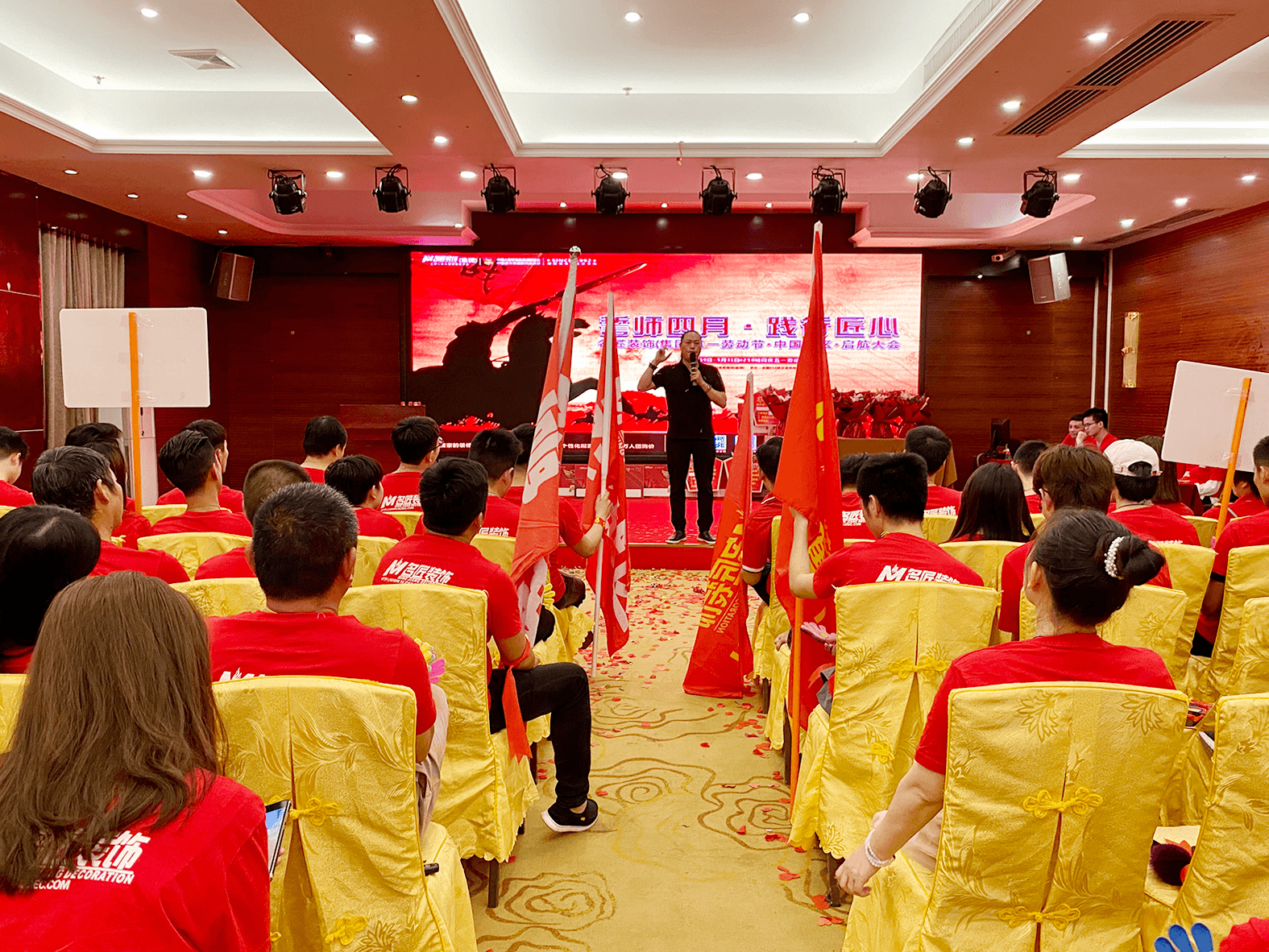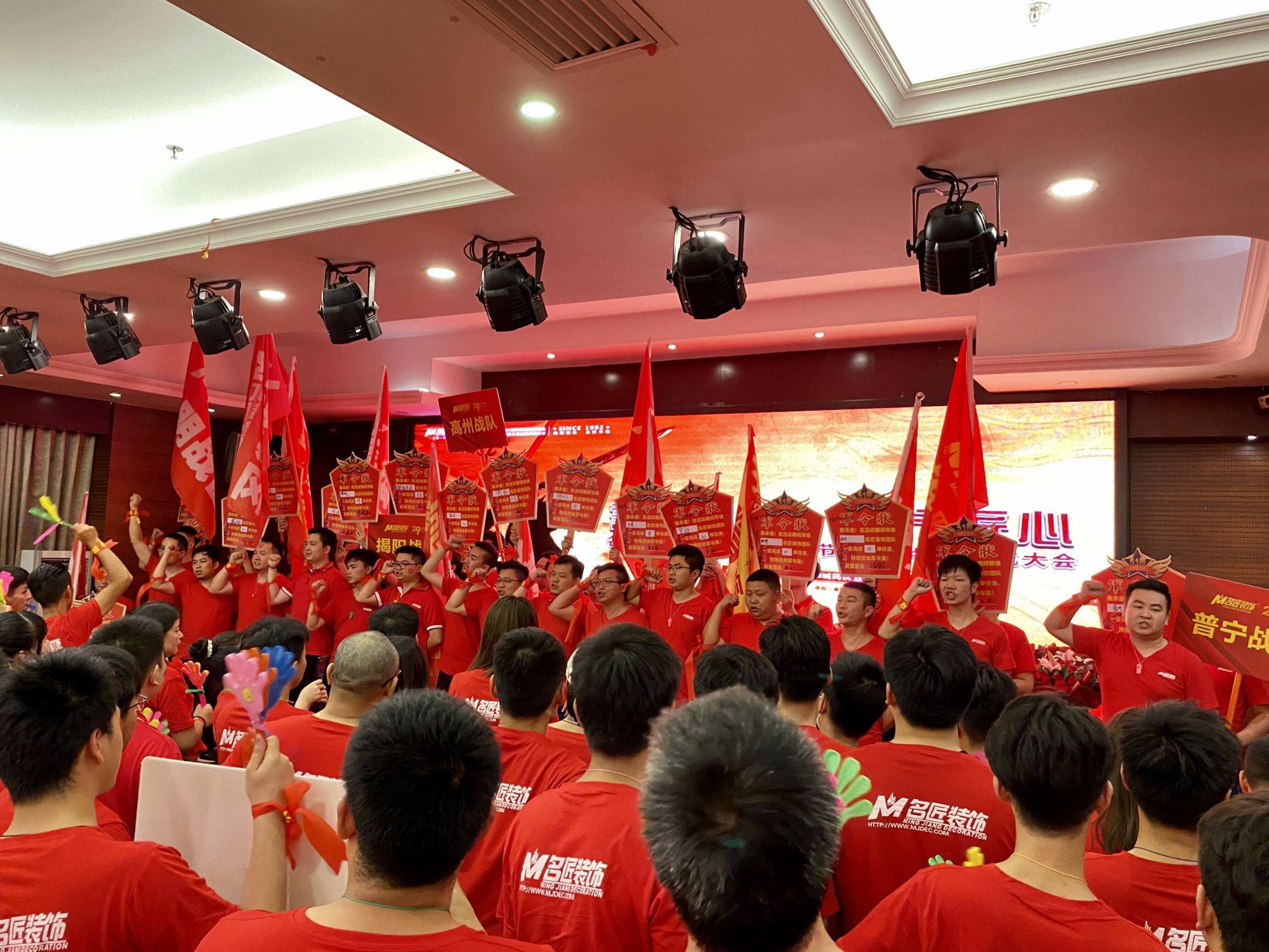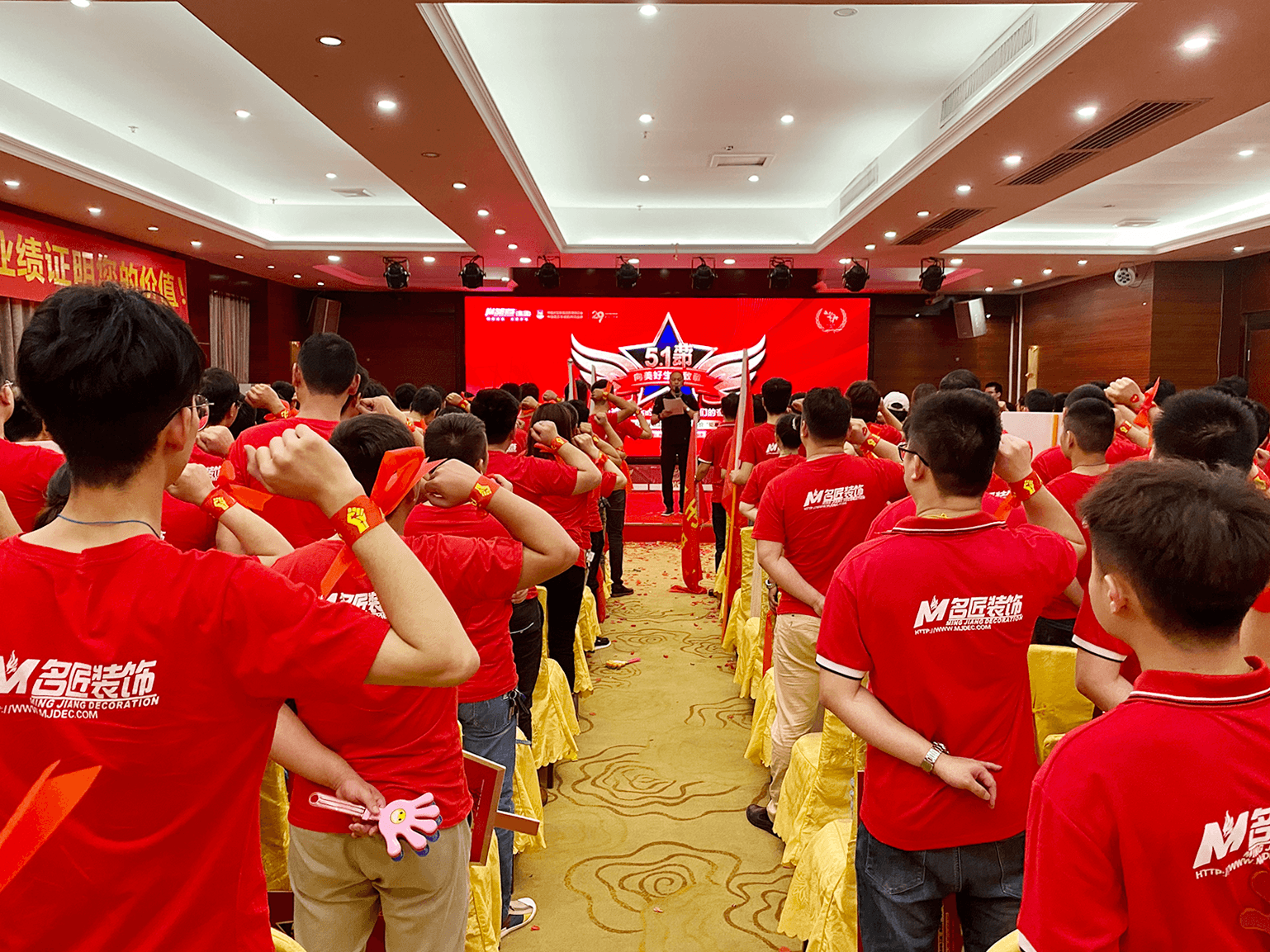 誓師大會上,300余名名匠人身著統(tǒng)一的服裝,步伐整齊地列隊(duì)入場,組成壯觀的紅色海潮。每個(gè)人臉上都洋溢著輕松自信的笑容,斗志昂揚(yáng),許下奮斗目標(biāo)。