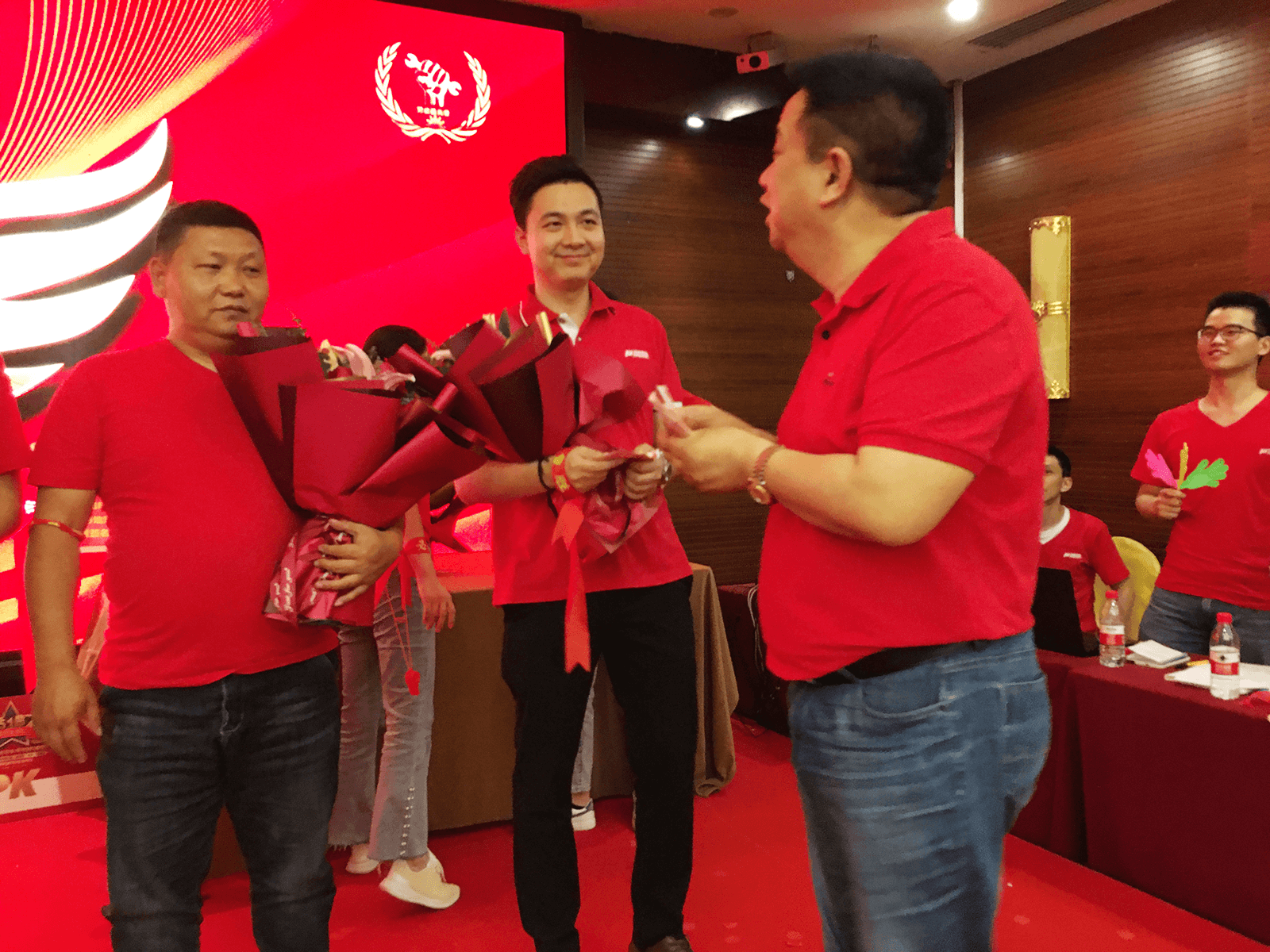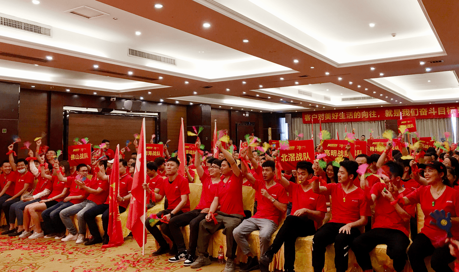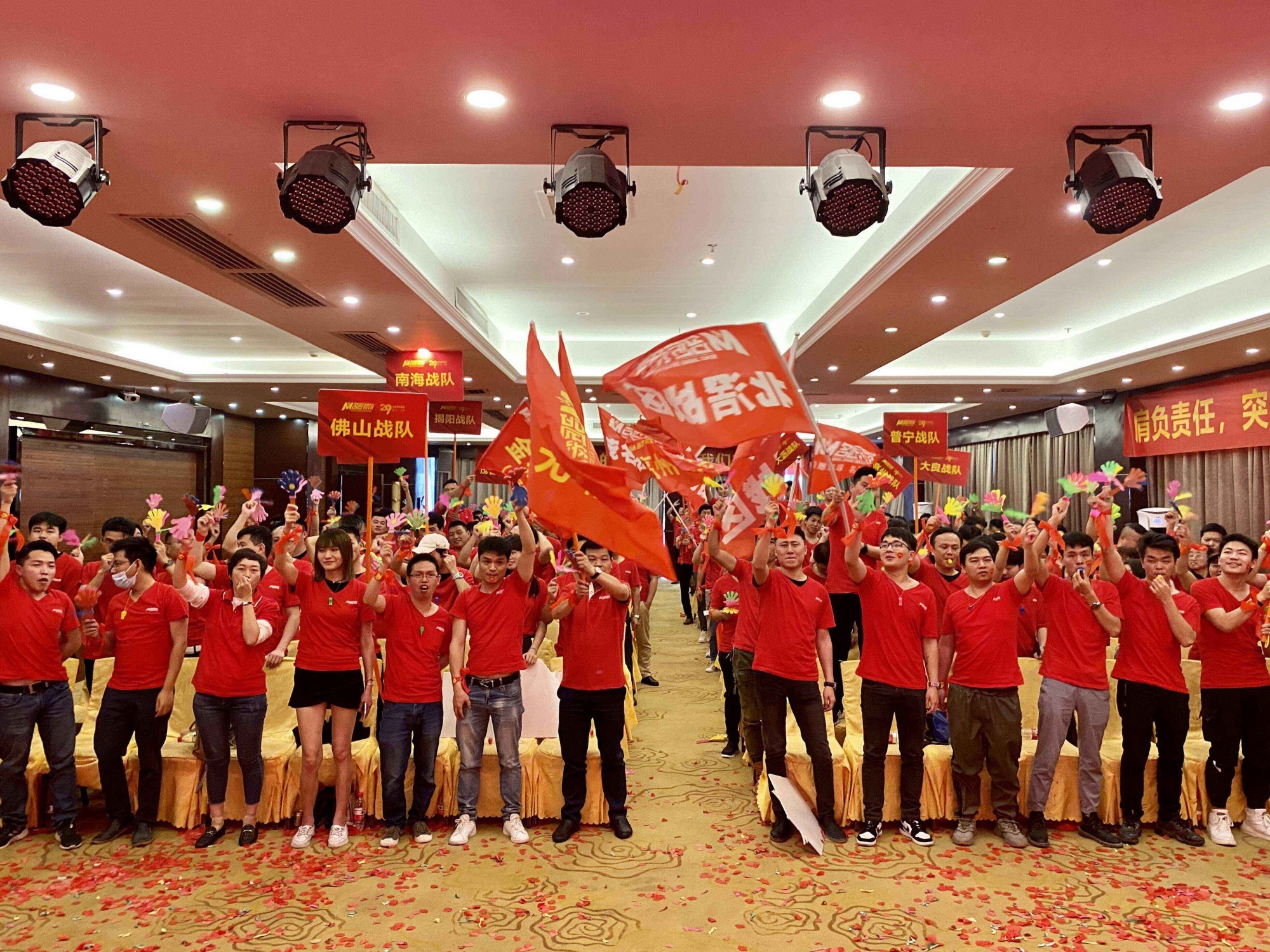 誓師大會上,300余名名匠人身著統(tǒng)一的服裝,步伐整齊地列隊(duì)入場,組成壯觀的紅色海潮。每個(gè)人臉上都洋溢著輕松自信的笑容,斗志昂揚(yáng),許下奮斗目標(biāo)。